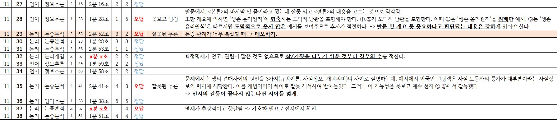 위는 제가 피셋을 공부하면서 정리한 오답노트입니다. 보시면 유형 분류/시간 기록/틀린 이유와 사고 과정이 모두 적혀 있습니다. 모든 5급/민경채 문제에 대해 위와 같이 정리했습니다. 머리로 생각만 하는 것과 기록으로 정리해놓는 것은 큰 차이가 있다고 생각합니다.