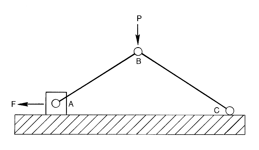 토글 기구(toggle mechanism)에 대한 설명이다. 토글 기구는 작은 조작력으로 큰 힘을 얻기 위해 쓰이는 기구이며, 배력 기구라고도 한다. 같은 일을 할 때 거리 및 속도가 작으면 힘이 커지는 원리를 이용한 것이다.