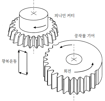 3-ii)피니언커터(pinion)를 사용하는 방식에는 커터가 왕복운동, 기어가 회전이송을 한다. 내접기어의 가공이 가능하다.