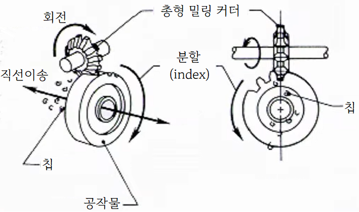 1)밀링(milling) - 총형커터 또는 엔드밀커터를 이용한다. 주로 대형기어의 제작에 사용한다. 이의 홈 1개를 가공하면 분할대(index)를 사용하여 기어를 1피치만큼 회전한 후 다시 가공한다. 피치나 압력각이 바뀌면 다른 커터를 사용하여야 한다. 기어 이의 크기가 큰 경우에 사용된다.