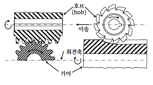 2)호빙(hobbing) - 호브공구가 기어축에 평행한 방향으로 왕복이상 및 회전운동을 하며 절삭하고, 기어는 회전이송을 한다. 피치와 압력각이 같으면 잇수에 상관없이 계속 사용이 가능하다. 높은 생산속도가 가능하며 대량생산에 적합하다. 스퍼기어, 헬리컬기어 등을 제작할 수 있다.