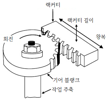 3-i)랙커터(rack)를 사용하는 방식에는 마아그 방식(래크공구가 축방향으로 왕복운동, 기어는 회전이송과 축방향이송) 및 선더랜드 방식(래크공구가 축방향으로 왕복운동, 기어는 회전이송) 방식이 있다. 랙커터의 이끝높이와 이뿌리높이는 각각 가공되는 기어의 이뿌리높이와 이끝높이와 관계된다.