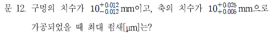 최대 죔새는 축의 최대허용치수와 구멍의 최소허용치수의 차이를 구하면 된다. (최대 죔새)=(+0.025mm)-(-0.012mm)=0.037mm=37㎛