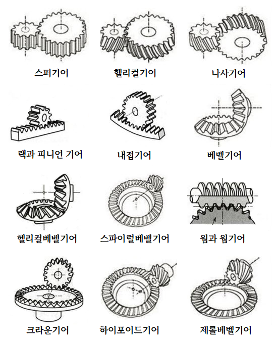 1)두 축이 평행할 때 : 스퍼기어, 헬리컬기어, 헤링본기어(헬리컬기어 2개를 연결), 내접기어