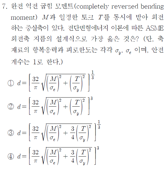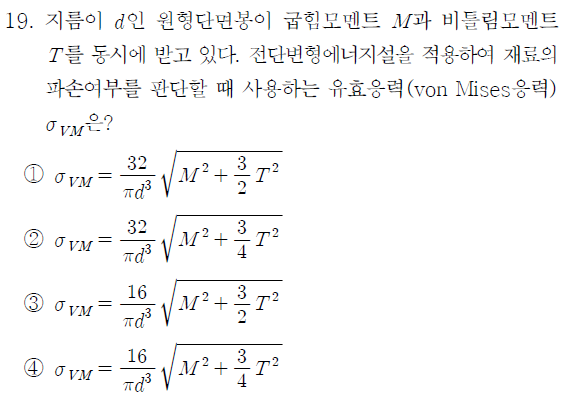 선지를 보면 단면계수 Z=πd³/32에 관한 식을 d에 대해 정리한 것임을 알 수 있습니다. 따라서 ②, ④ 선지는 소거됩니다. ①, ③ 선지의 경우 (T/σy)²에 곱해진 계수의 차이를 볼 수 있습니다. 문제에서 전단변형에너지를 언급했으므로 σ_{VM}=√(σ²+3τ²)의 식이 문제풀이에 사용될 것이며 따라서 3이 존재하는 ③이 정답이 됩니다.