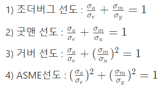 이러한 유형은 한번밖에 나오지 않았기도 하고 그렇게 복잡하진 않지만 제 나름대로 빠르게 해결했던 방법을 공유해 보겠습니다. 정석적인 풀이는 아래의 굿맨선(Goodman line)에 σ_e=300MPa와 σ_u=900MPa를 대입하고 선지의 평균응력과 응력진폭을 각각 σ_a, σ_m의 자리에 넣어 나오는 값을 비교하는 것입니다.