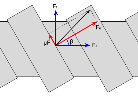 F : 전달력/회전력/접선방향의 힘, Fn : 기어 잇면에 수직하게 작용하는 힘, Ft : 축방향의 힘/추력(thrust), β : 헬리컬기어의 비틀림각