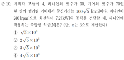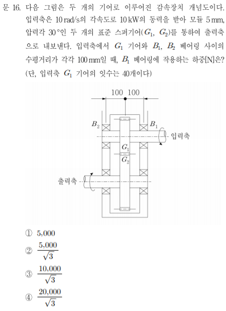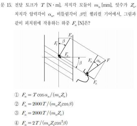 따라서 답은 3번입니다. 이 문제에서 중요하게 보아야 할 점은, 치직각모듈을 통해 피치원상 하중(전달력)을 구할 때에는 최종 결과값에 cosβ값이 약분된다는 것입니다. 이것을 이용해 계산을 더 단축시킬 수 있을 것입니다.