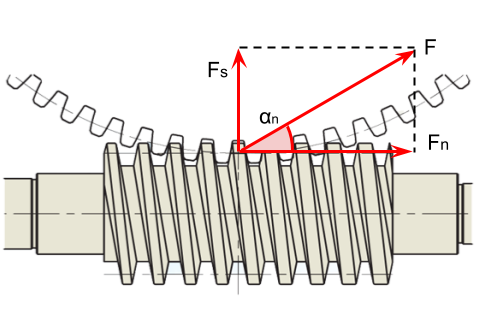 F : 웜과 웜기어 잇면에 수직하게 작용하는 힘(전체 하중), Fs : 분리력, Fn : 저항력