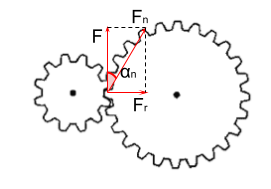 Fn : 기어 잇면에 수직한 힘/베어링에 작용하는 힘, F : 기어의 전달력/회전력/접선방향의 힘, Fr : 반경방향의 힘, αn : 압력각