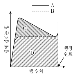 문 10. 다음 그래프는 직접압출과 간접압출에서 램의 위치에 따라 램에 걸리는 힘을 개략적으로 보여 준다. A와 B는 각 그래프에 해당하는 압출 방식을 지칭하며, C와 D는 해당 영역에서 램에 걸리는 힘의 원인이다. A, B, C, D에 해당하는 용어를 순서대로 바르게 나열한 것은? (단, C는 A그래프에서 힘의 원인 중 D를 제외한 것이다)