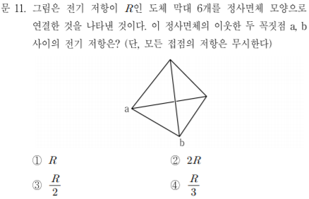 R=합분의 곱!이렇게 외우면 쉽습니다. 또한 두 저항이 같은 값일 때 병렬로 연결되어 있으면 합성저항은 그 절반이 됩니다. 위 문제를 말로 풀어보자면 오른쪽부터 2R, 2R/3, 5R/3, 5R/8, 5R/8+X가 됩니다. X는 1-5/8=3/8이 되어야 하므로 답은 3번입니다.