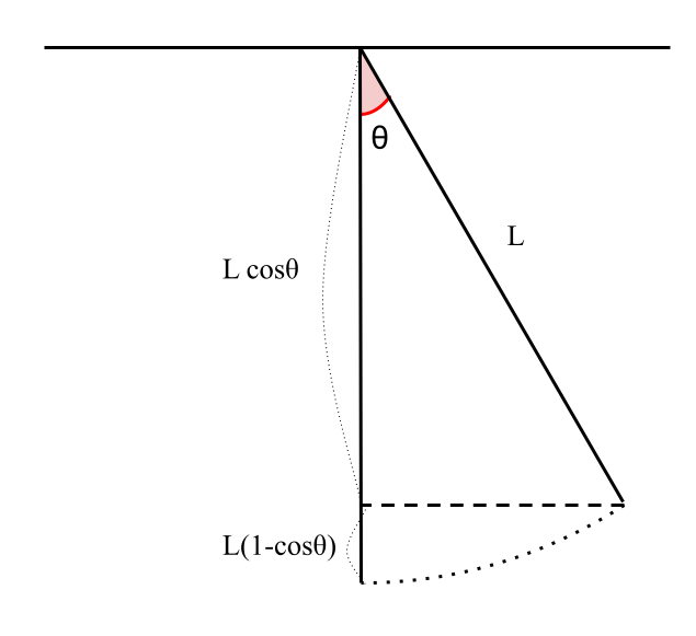 위 그림은 단진자가 최고점에 이르렀을 때, 즉 속력이 0인 때를 기준으로 그린 것입니다. 단진자가 아래로 운동함에 따라 점점 속력을 얻게 되고, 이것이 구심력의 형태로 나타나 장력이 커지게 됩니다. 따라서 다음과 같이 장력을 표현할 수 있습니다.