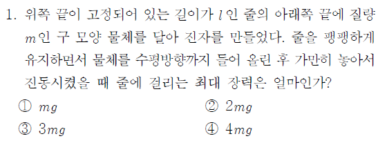 이 문제는 cosθ가 0인 경우로 볼 수 있습니다. 따라서 답은 mg(3-0)=3mg로 3번입니다. 다음은 올해 지방직 문제입니다!