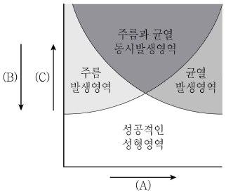 문 9. 다음은 딥드로잉(deep drawing) 공정에서 컵 형상을 성형할 때 블랭크 홀딩력, 블랭크 두께, 컵 드로잉 깊이의 변화에 따른 가공결함 발생영역을 보여주고 있다. 그림에서 (A), (B), (C)에 해당되는 것을 바르게 연결한 것은? (단, 화살표는 수치가 증가하는 방향을 의미한다)