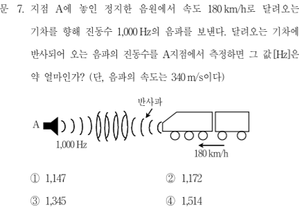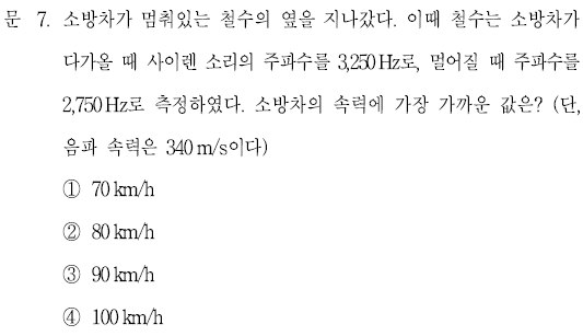 3250=3000+250, 2750=3000-250인 것이 보인다면, 위 식의 좌변은 13/11인 것을 알 수 있을 것입니다. 그에 따라 식을 정리해주면 v=340/12=28.3이 나오는데 단위를 km/h로 바꿔주어야 하므로 36을 곱한 후 유효숫자를 비교해야 합니다. 28×36=1008이므로 100km/h와 비슷합니다. 따라서 답은 4번입니다.