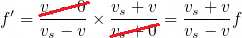 v_s가 음파의 속력, v_a가 음원의 속력, v_b가 관찰자의 속력입니다. 위 식의 모양을 기억하기는 어렵지 않을 것입니다. 위 문제에서 v_a=v이고, v_b=0이므로 이를 대입하면 다음과 같습니다.