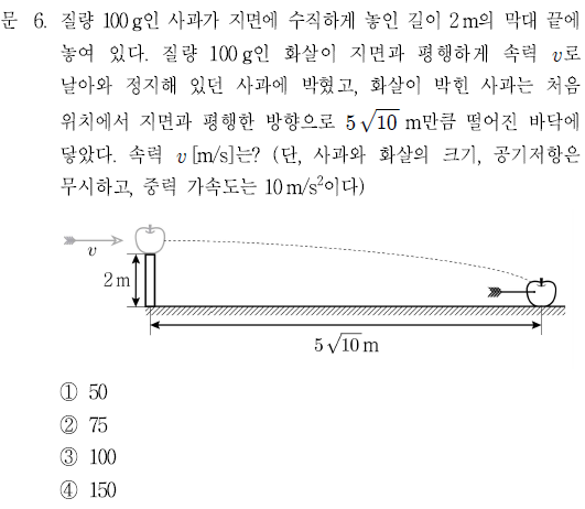 두 질량이 동일한 물체가 합쳐져 속력이 25m/s가 되었으므로 운동량 보존에 의해 처음 속도는 그 두배인 50m/s. 답은 1번입니다.