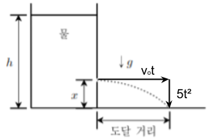 수평거리 l은 v_0t이며, v_0은 구멍의 수면으로부터 깊이의 제곱근에 비례합니다.(v_0=√2gh이므로)
