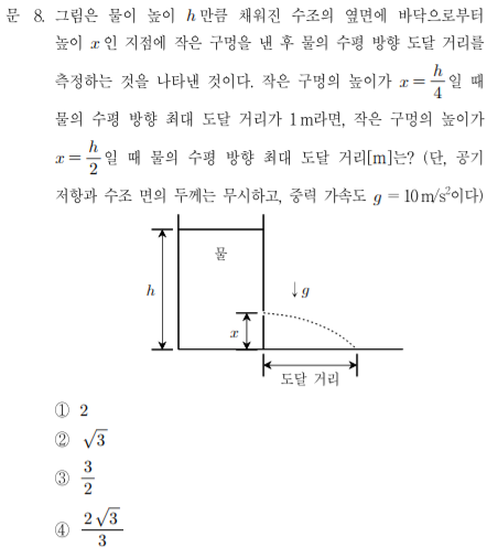 수면으로부터 깊이는 처음엔 3h/4이고, 나중엔 h/2으로 2/3배가 되었으므로 v_0은 √(2/3)배가 됩니다.