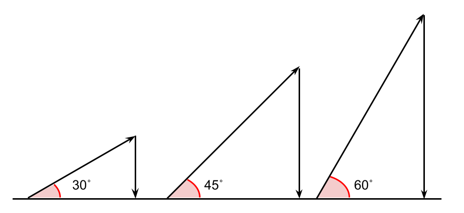 이 벡터로 투사체의 포물선 운동을 일반화해서 나타내볼 수도 있습니다. 왜냐하면 대부분의 경우 삼각함수 계산의 편의를 위해 발사각이 30도, 45도, 60도로 나타나기 때문입니다. 초속도가 동일하다고 했을 때 이에 해당하는 경우를 각각 그릴 수 있습니다.