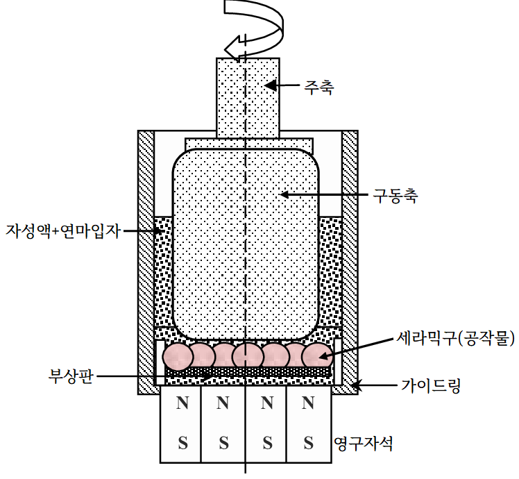 ③ 자기부상가공(magnetic float machining)은 연마입자와 미세한 자철분말을 섞은 용액을 채운 후 세라믹구(공작물)와 함께 공구와 자석이 접촉된 판 위에 넣고 구동축으로 가압하여 다듬질한다.