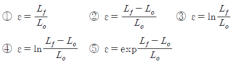 14. 재료의 인장시험에서 원래 표점거리가 Lo인 시편이 인장 시험을 통해 표점거리가 Lf 로 늘어났다. 이 때의 진변형률(true strain) ε를 구하는 식으로 옳은 것은?
