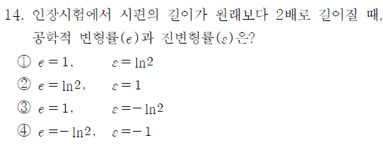 14. 인장시험에서 시편의 길이가 원래보다 2배로 길어질 때, 공학적 변형률(e)과 진변형률(ε)은?