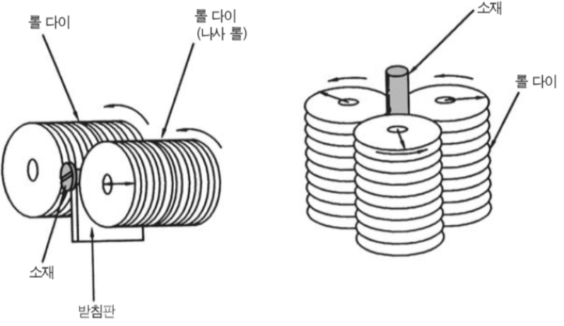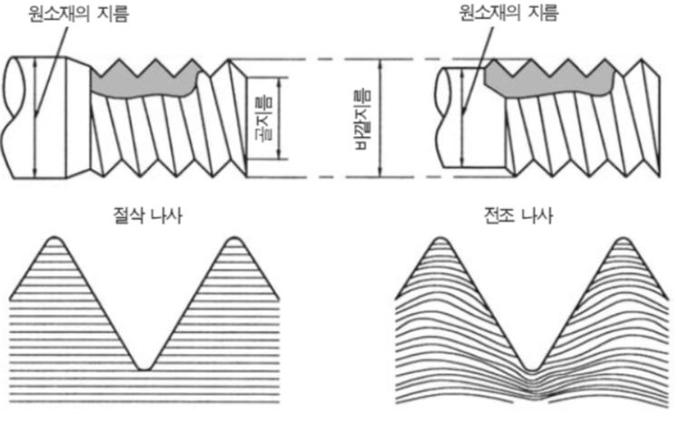 ① 절삭가공에서는 재료 손실이 발생하지만 전조공정은 소성가공이므로 재료손실이 발생하지 않는다.